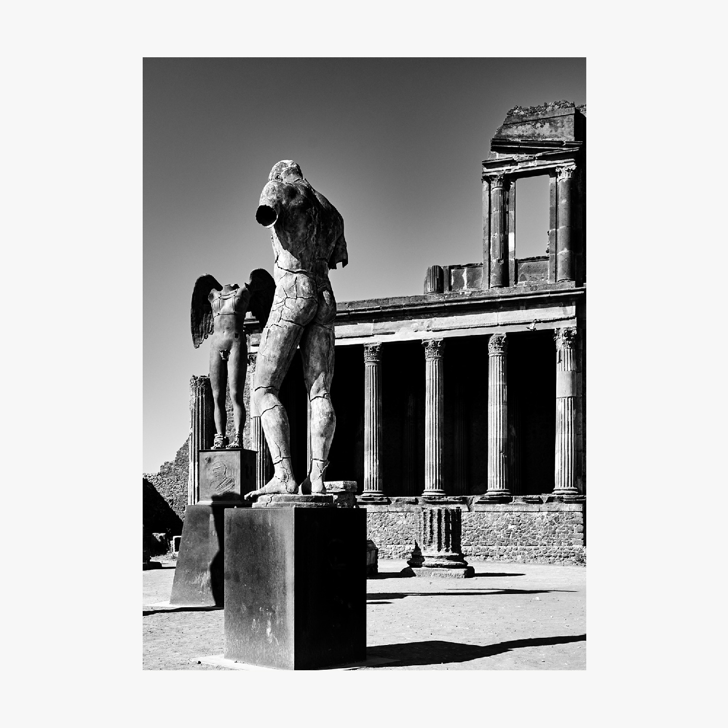fusione tra lo spazio urbano del passato e l’arte contemporanea si è presentata così perfetta da annullare tutto il tempo intercorso tra gli abitanti dell’antica città e la contemporaneità che si esprime attraverso le opere dell’artista. Questo progetto fotografico nasce nel 2016, dal consiglio di una persona cara. Sini ha deciso quindi di indagare più a fondo, di combinare la sua esperienza di fotografo di architettura contemporanea e l’esposizione artistica, così da popolare la città perduta con nuove presenze dalla forte carica simbolica.